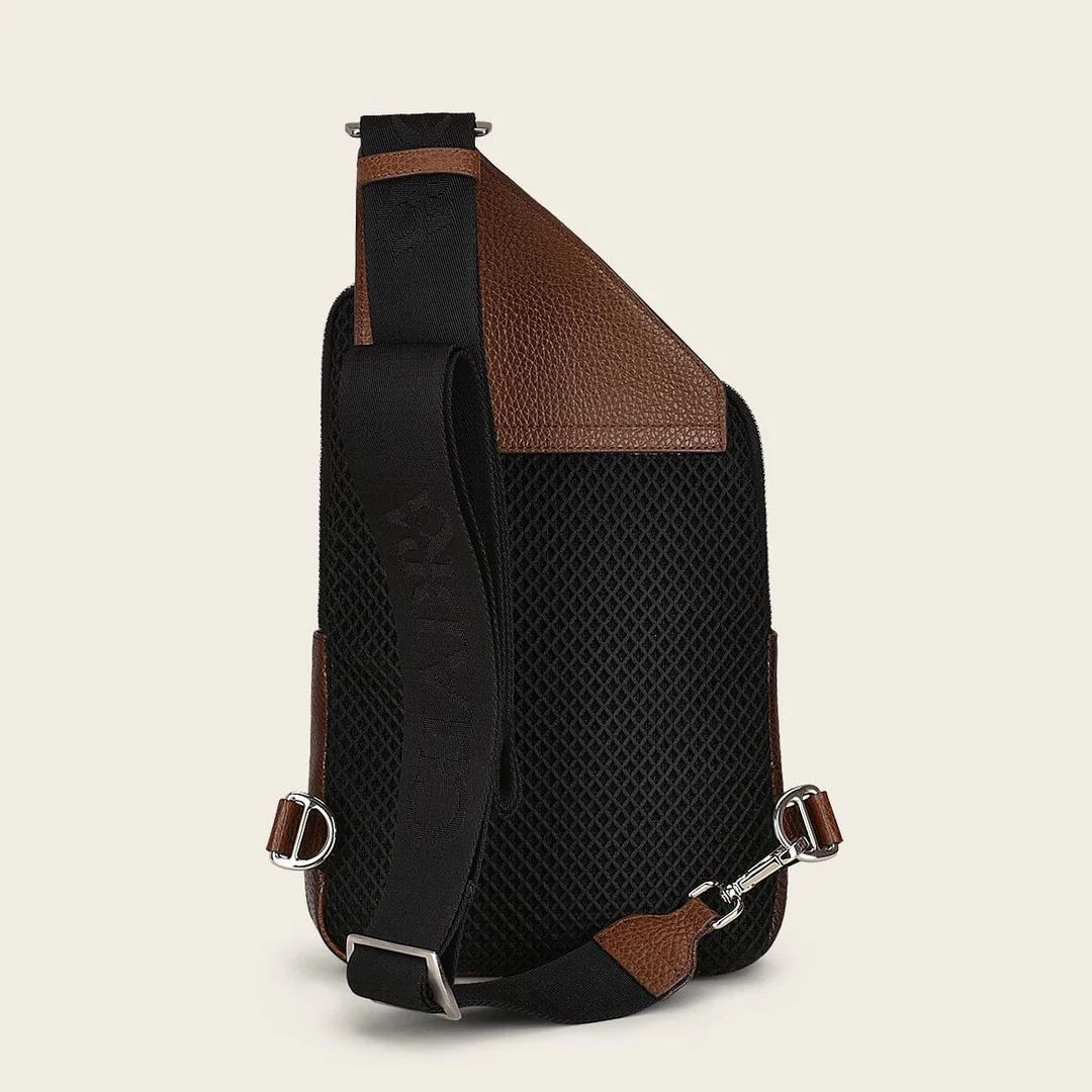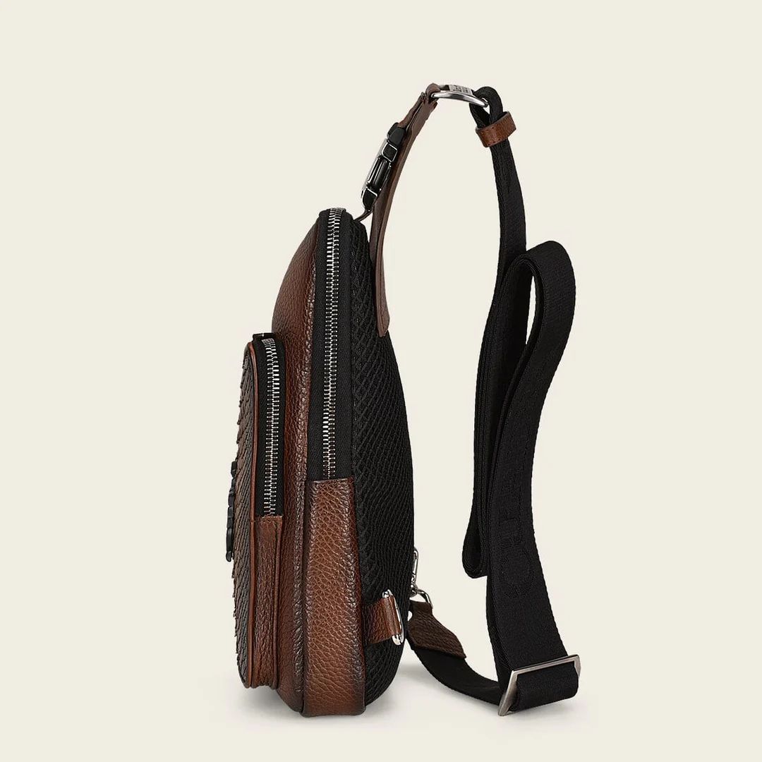 Bandolera para caballero en piel genuina de pitón y piel de bovino. Al frente presenta aplicación metálica de monograma Cuadra y broche metálico decorativo en la parte superior. Cuenta con dos compartimentos asegurados con cierre, el compartimento de mayor tamaño cuenta con cuatro espacios para tarjetas. Con asa de tela ajustable. Color café