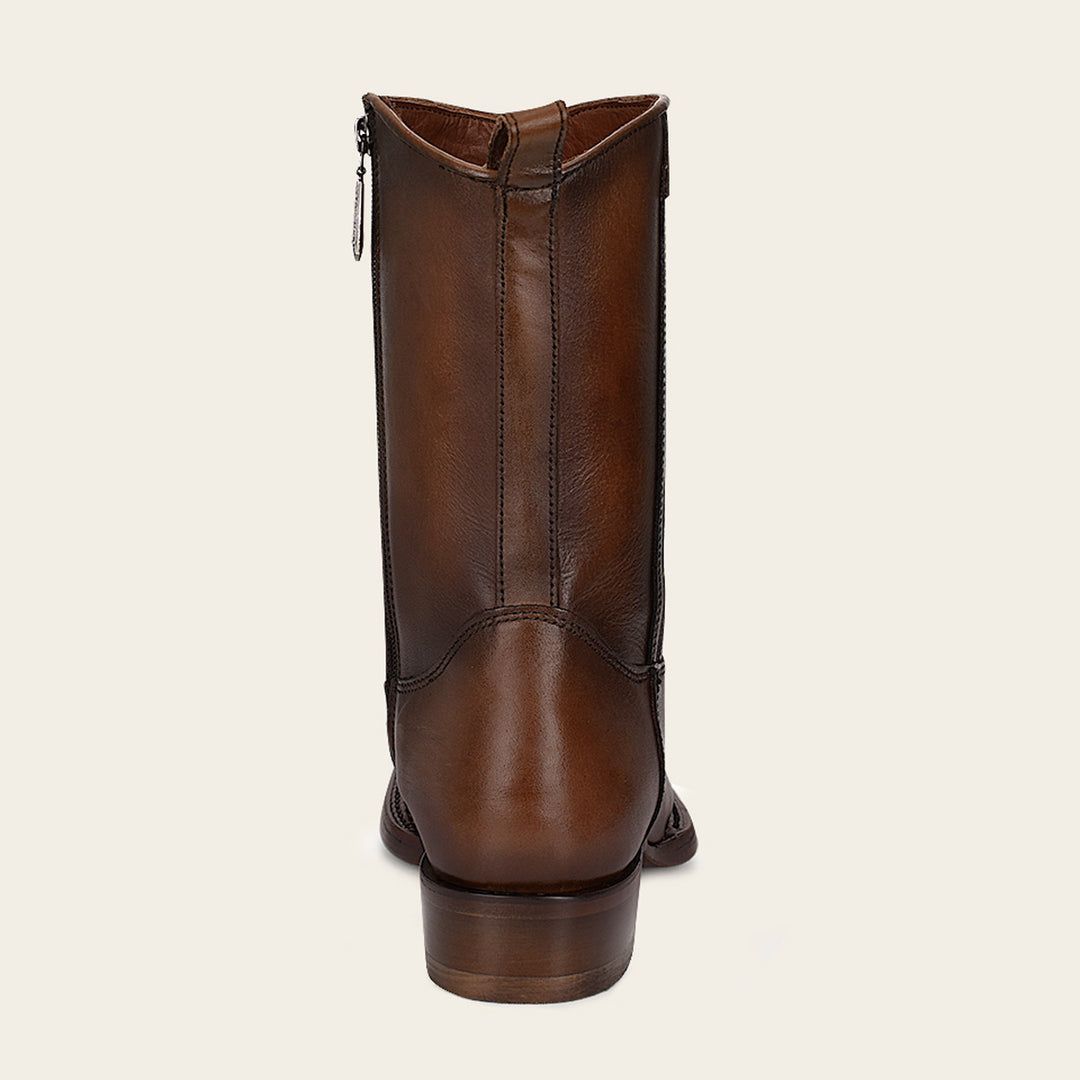 Bota para caballero en piel genuina de Caimán y piel de bovino. Sobre el tubo presenta grabado láser de logotipo Cuadra. Con detalles de tejido artesanal en los costados, que enmarcan la piel de fuscus. Ajustada con cierre interno. Con suela de cuero con injerto de TPU. Color almendra.