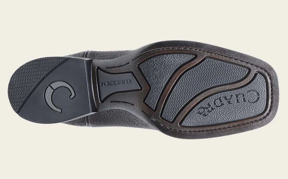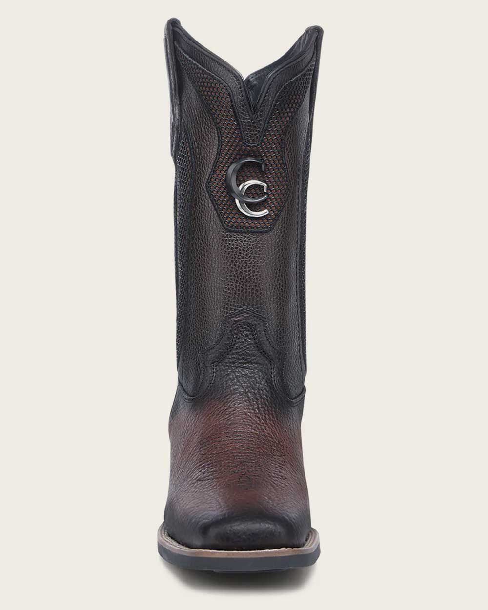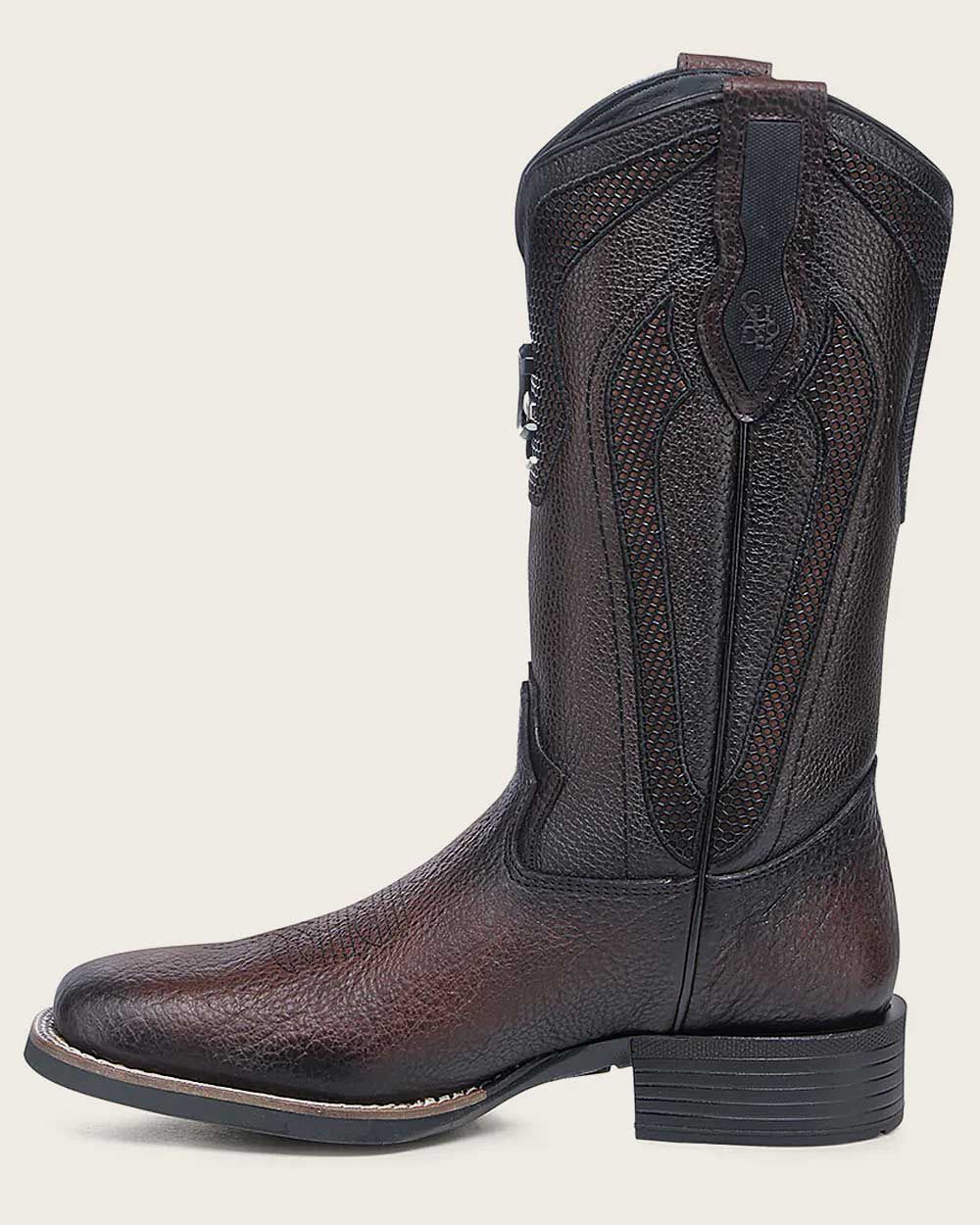 Bota rodeo en piel genuina de bisonte y piel de bovino para caballero. Presenta aplicaciones de KPU en motivos geométricos, tejido a modo artesanal en alto relieve, aplicación metálica doble del monograma Cuadra, aplicación del logotipo de la marca en alto relieve en orejas. Cuenta con las nuevas tecnologías: platilla flexrider, planta Ortholite y suela flexrider, que le dan mayor ligereza, confort, transpirabilidad y amortiguación. Tubo suave diseñado con entretelas.