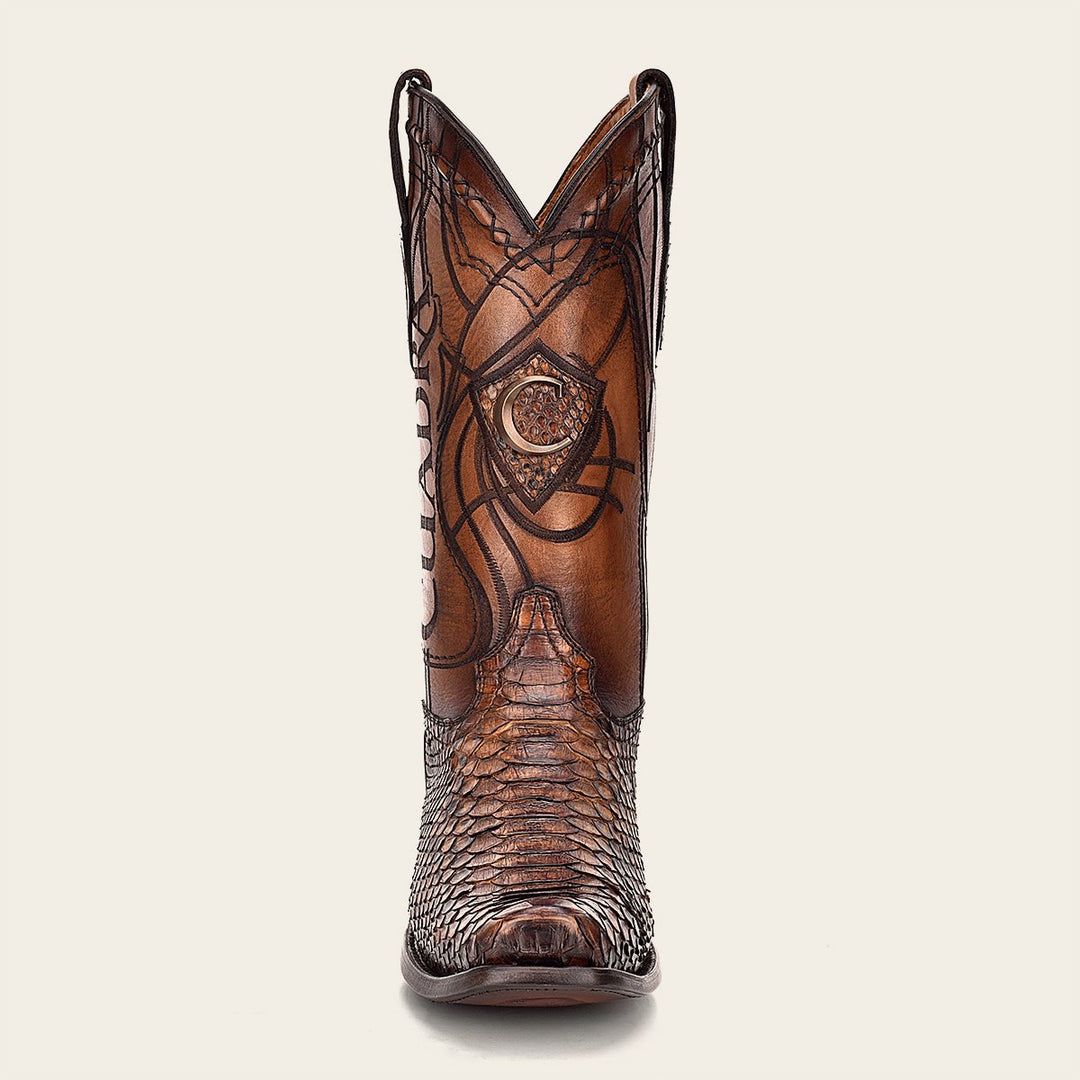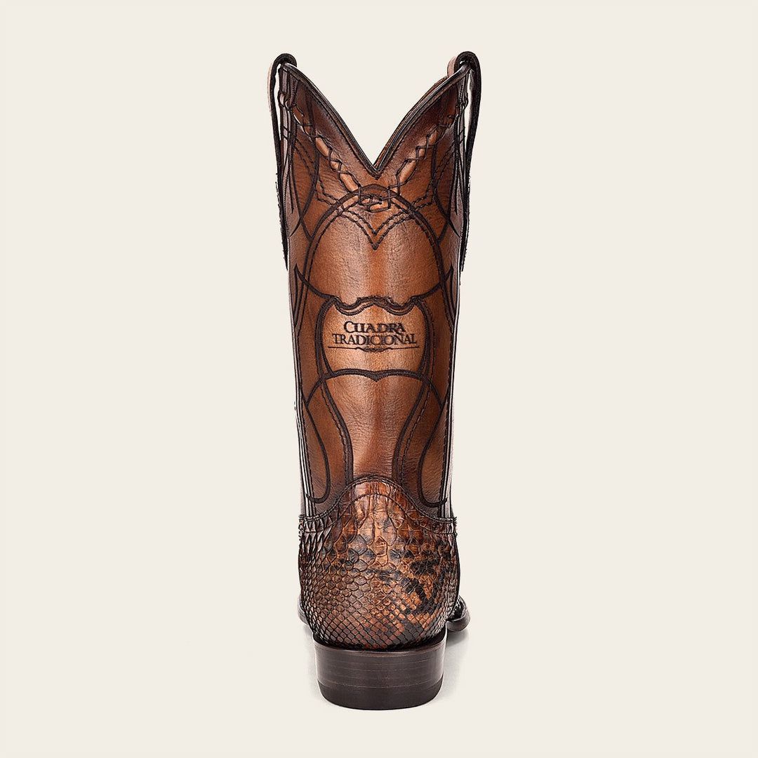 Bota tradicional para caballero en piel genuina de bovino. Diseño con detalles grabados en tubo, una combinación de líneas orgánicas en conjunto con el exclusivo logotipo Cuadra. Modelo pintado a mano. Color miel.