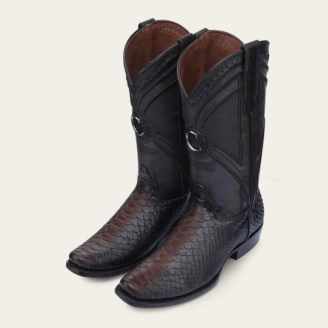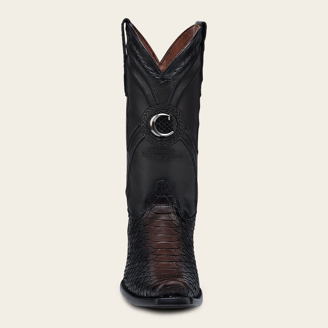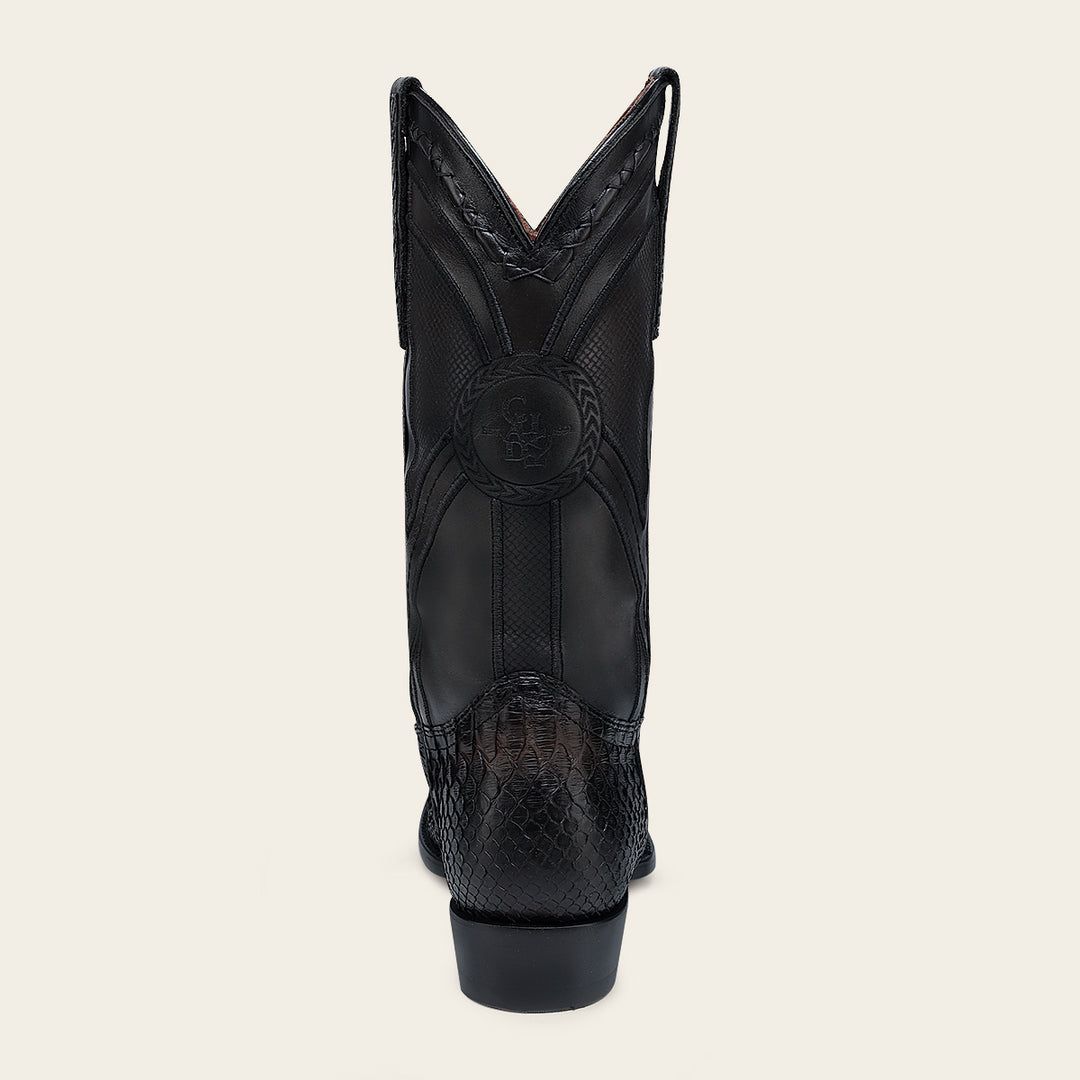 Bota vaquera para caballero en piel genuina de pitón y piel de bovino. El tubo cuenta con aplicación metálica del monograma Cuadra en la parte frontal, así como grabado en piel de la marca. Presenta detalles de bordado en alto relieve y contraste de texturas en la parte lateral del tubo. Las orejas cuentan con aplicación de piel genuina de pitón. Suela de cuero con injerto de TPU. Color negro.