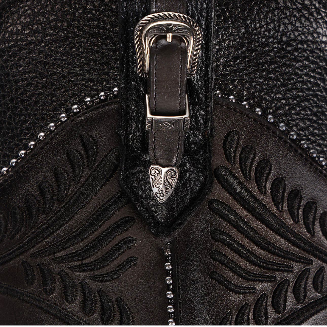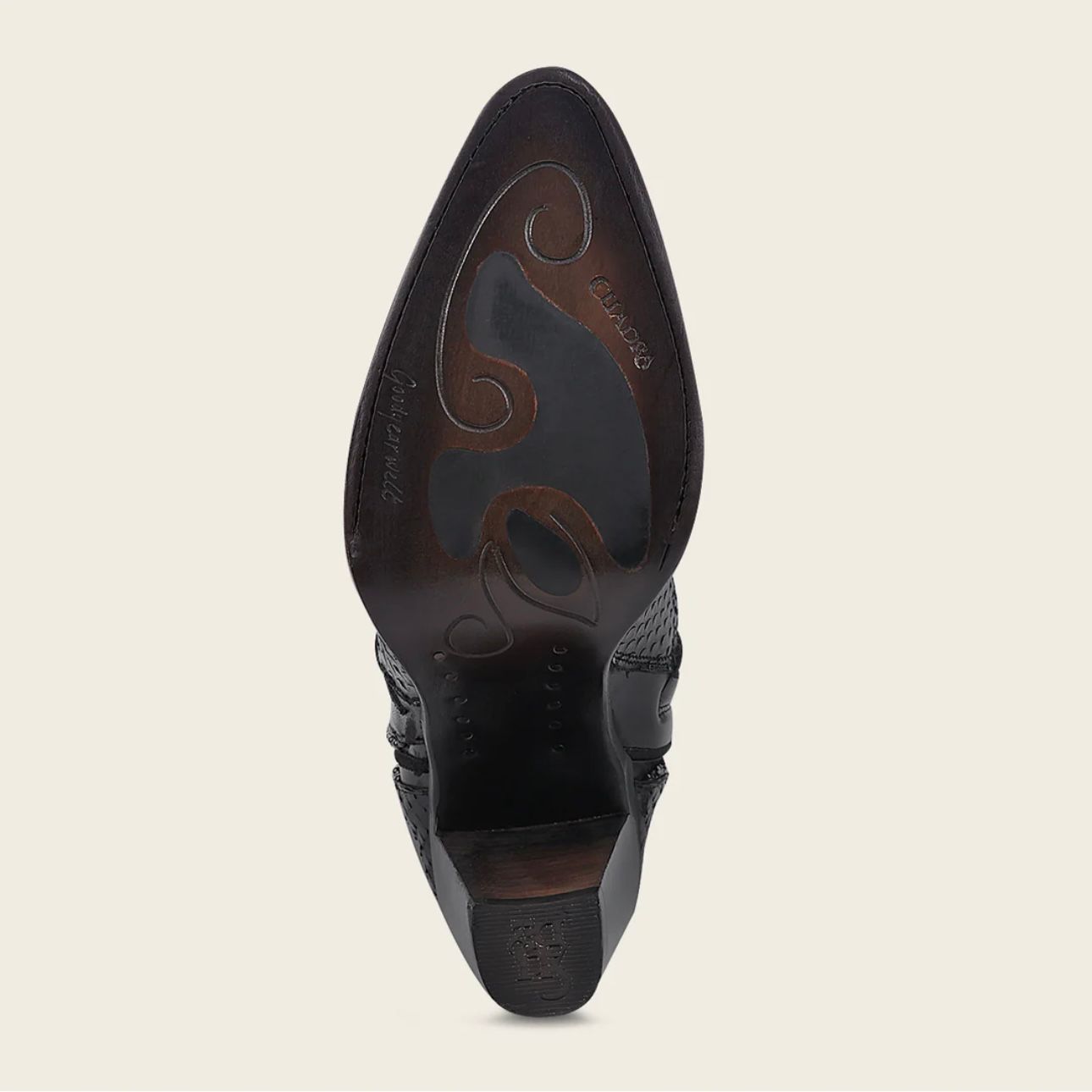 Bota para dama en piel genuina de pitón y piel de bovino. Presenta aplicación de cadena de piedras decorando chinela, talón, tubo y parte superior de la bota, así como detalles de bordado en alto relieve con motivos naturales. La oreja cuenta con hebilla decorativa estilo western. Ajuste por medio de cierre interno. Suela de cuero con TPU.