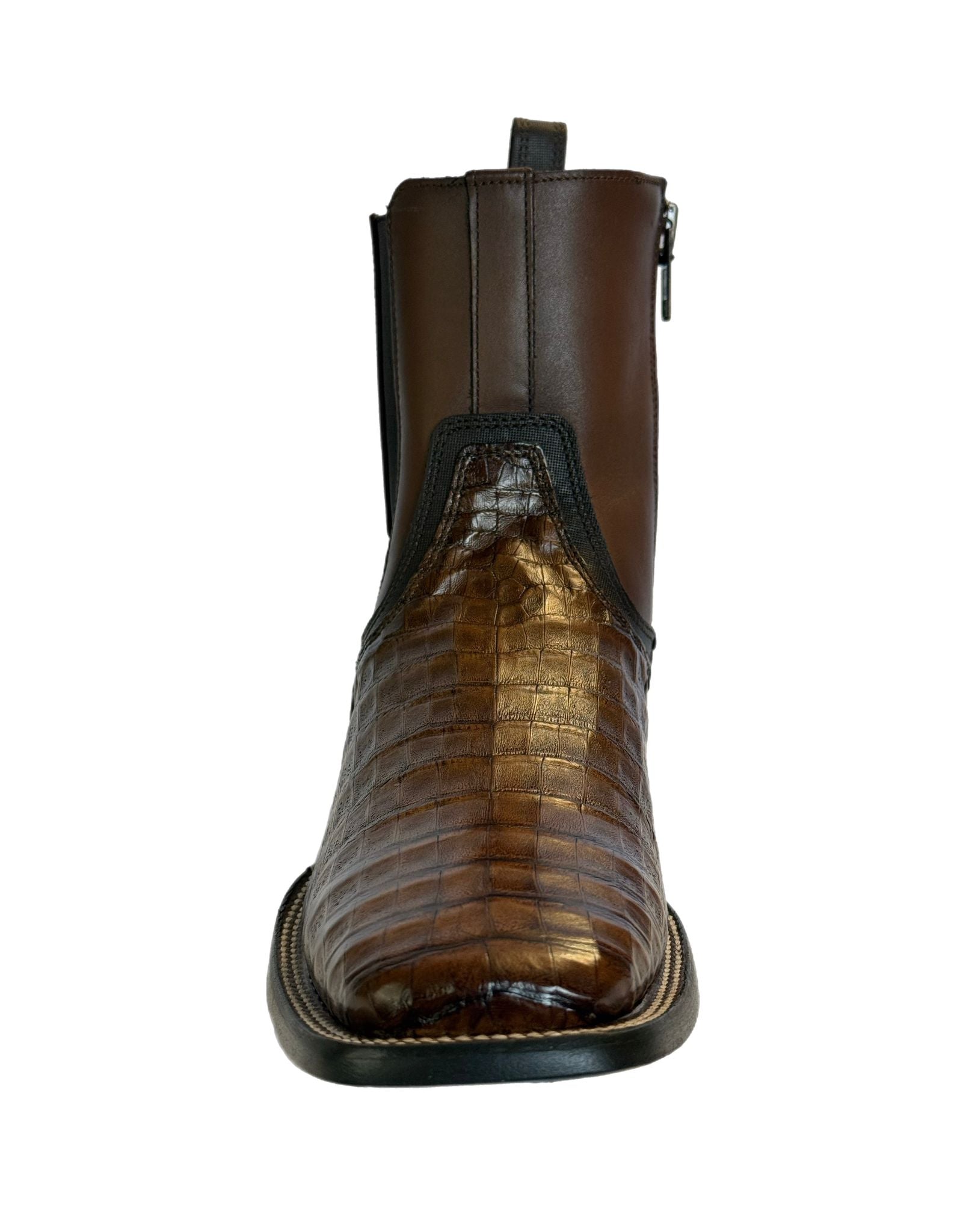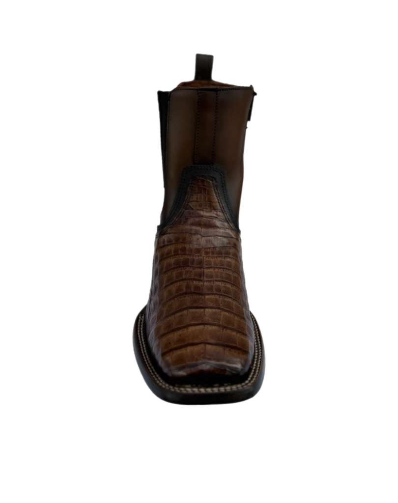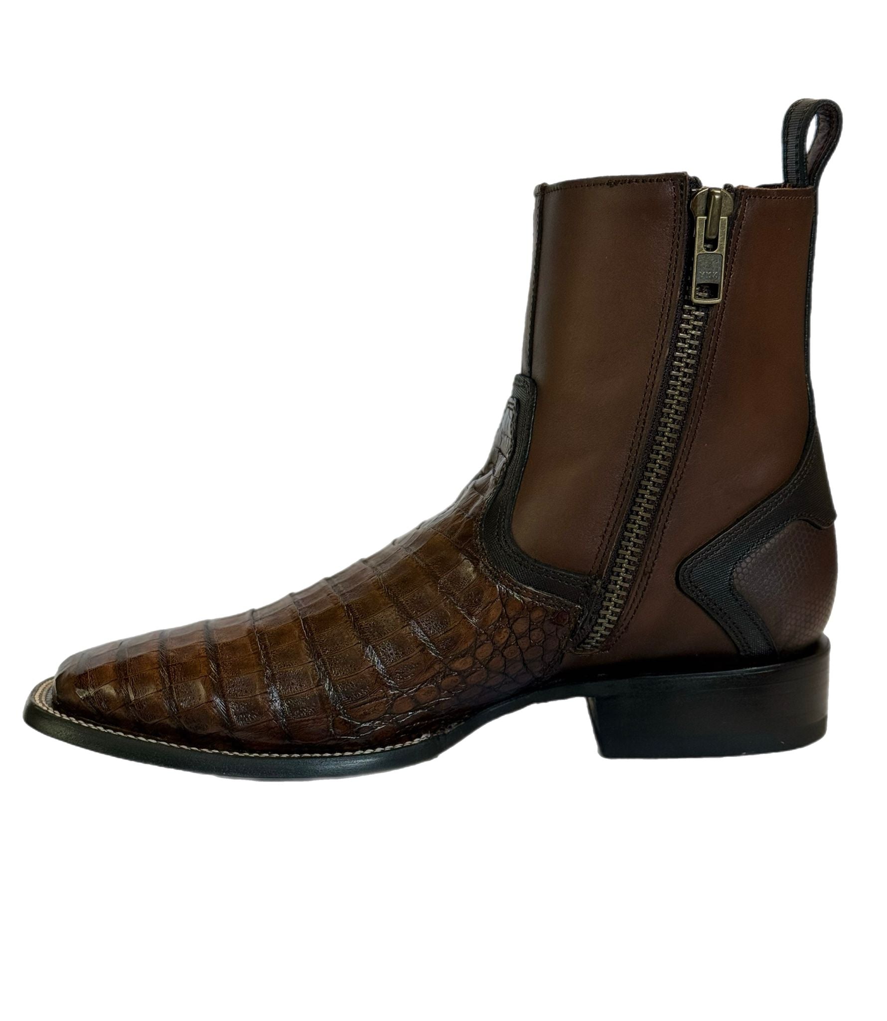 Botin urbano para caballero en piel genuina de Caiman. Presenta acabado semi brillante. La parte trasera y lateral cuentan con detalles en grabado láser. Ajustada con cierre interno. Suela de cuero con hule.
