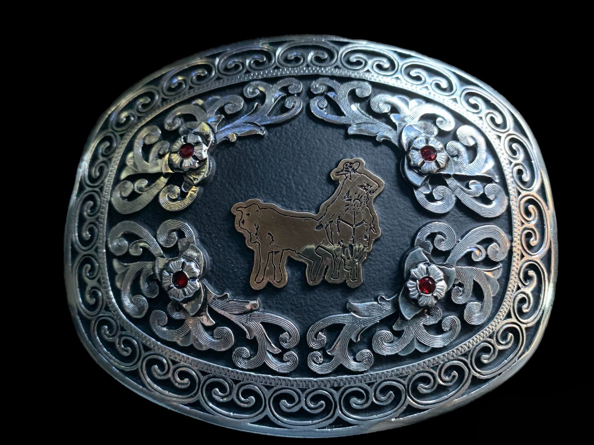 Hebilla Charra artesanal hecha a mano con color plateado con fondo negro y dibujo de la suerte charra color dorado y piedras rojas.